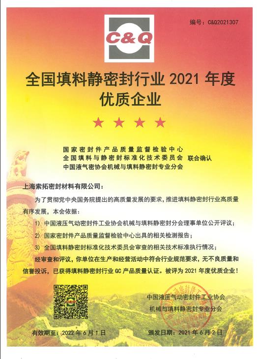 我司獲得全國填料靜密封行業(yè)2021年度優(yōu)質(zhì)企業(yè)稱號