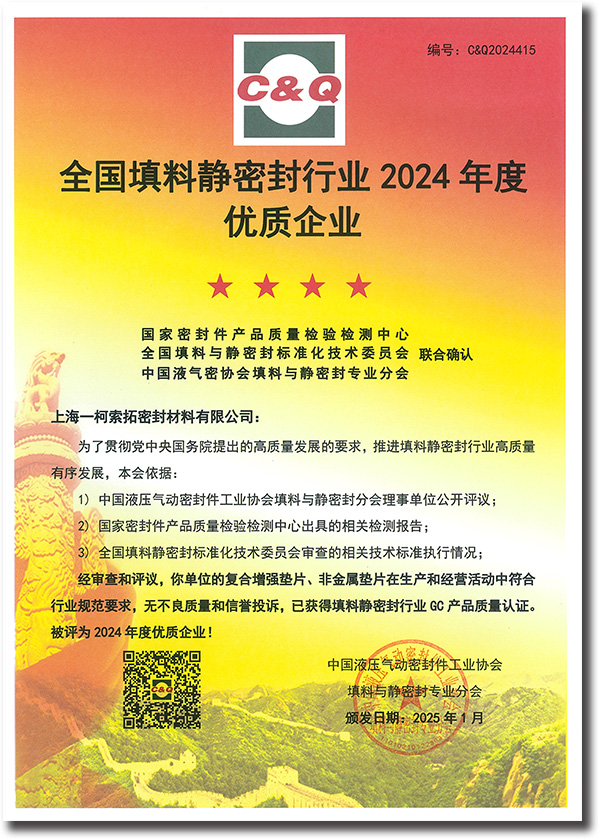 經(jīng)中國(guó)液壓氣動(dòng)密封件工業(yè)協(xié)會(huì)填料與靜密封專業(yè)分會(huì)嚴(yán)格評(píng)審,我司的復(fù)合增強(qiáng)墊片、非金屬墊片在生產(chǎn)和經(jīng)營(yíng)活動(dòng)中符合行業(yè)規(guī)范要求,無(wú)不良質(zhì)量和信譽(yù)投訴,并且獲得行業(yè)GC質(zhì)量認(rèn)證,成功斬獲"全國(guó)填料靜密封行業(yè)2024年度優(yōu)質(zhì)企業(yè)"認(rèn)證。這份榮譽(yù)是對(duì)我司二十載深耕密封領(lǐng)域的高度肯定。