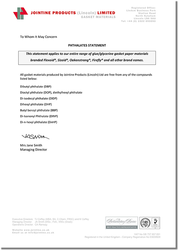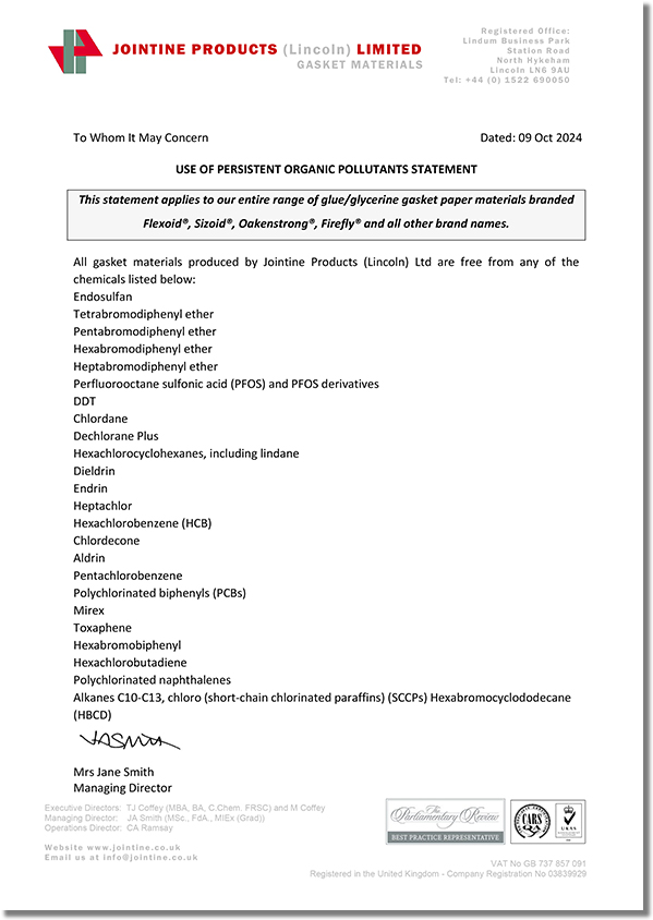 JOINTINE是全球領(lǐng)先的高質(zhì)量耐油植物纖維紙墊片材料制造商,其名下的品牌產(chǎn)品Flexoid/福來德、Cranflex是一種環(huán)保的耐油纖維紙墊片材料,可廣泛應(yīng)用于汽車、發(fā)動機(jī)、傳動設(shè)備等行業(yè),如下是JOINTINE發(fā)布的環(huán)保聲明函。
